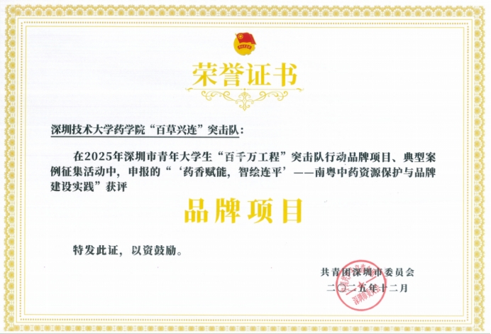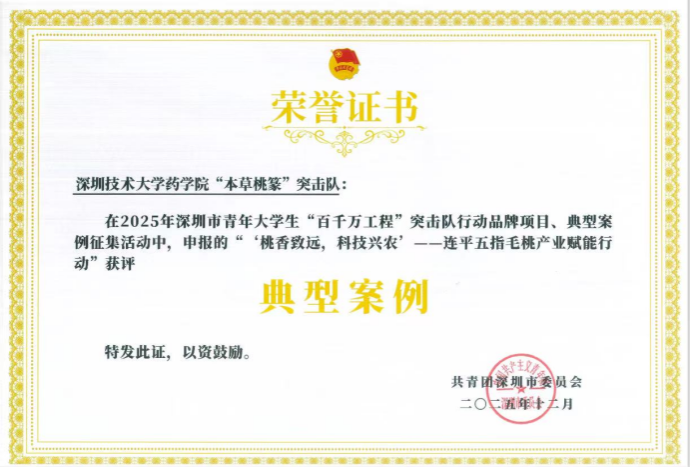 热讯传来!2025年12 月 9 日,在深圳市“百千万工程”突击队评选颁奖活动中,深圳技术大学药学院同学凭借扎实的实践成果与创新的服务模式,斩获两项重要奖项:百草兴连突击队获 “品牌项目” 奖项;本草桃篆突击队获 “典型案例” 奖项。
