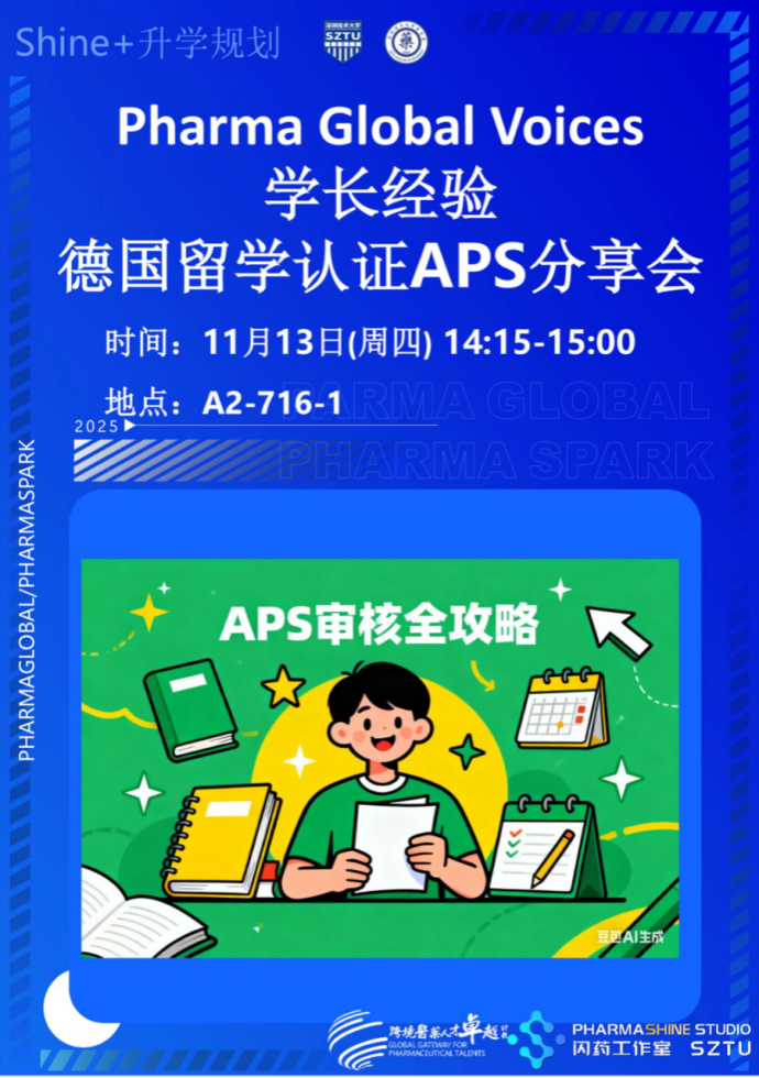 为进一步助力药学院学子拓展国际视野、规划海外深造路径,Pharma Global 于2025年11月13日(周四)下午14:15在A2-716-1教室成功举办了“学长经验——德国留学认证APS分享会”。本次活动由Pharma Global主办,旨在为有意向赴德深造的同学提供权威、实用的APS审核备考指导。